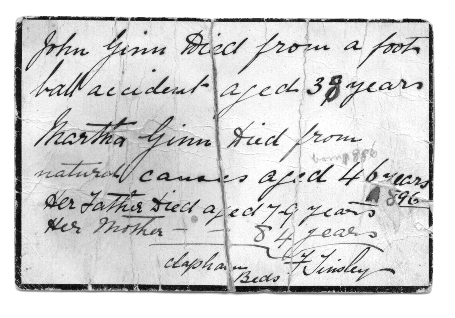 An undated card, written by F Tinsley, with some notes about John and Martha Ginn, my Great-Grandparents.