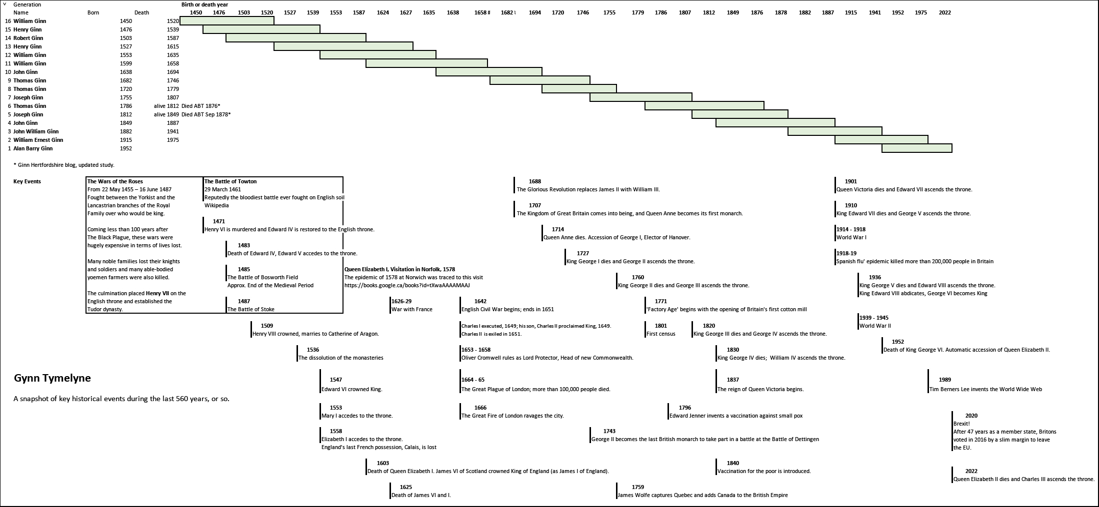 A snapshot of key historical events during the last 560 years, or so. Genealogy is not just about dates and names or who begat whom, it is also about connecting to history.